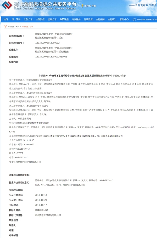 "2019 Comprehensive Treatment of Over-Extraction of Groundwater in Fucheng County Rural Domestic Water Source Replacement Project"